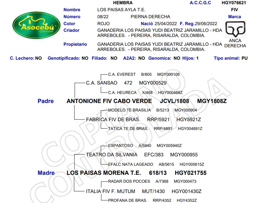 Hija de Antonione FIV Cabo Verde, destacado reproductor con influencia en estructura y fertilidad, y de Los Paisas Morena T.E., donadora probada del hato, Ayla concentra genética confiable para programas de multiplicación, transferencia de embriones y proyección productiva a mediano y largo plazo.
