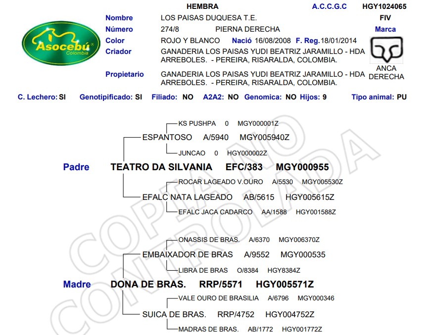 LOS PAISAS DUQUESA T.E. FIV es una hembra Gyr de alta calidad genética, resultado de una línea probada y reconocida por su aporte al mejoramiento productivo y funcional del ganado cebuino. Hija del destacado Teatro da Silvania EFC/383, sobre la matriz Dona de Bras RRP/5571, concentra una genealogía sólida con fuerte influencia de reproductores élite de Brasil.