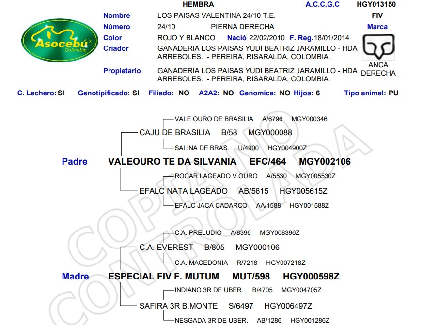 Los Paisas Valentina 24/10 T.E. FIV es una hembra Gyr pura de sólida estructura genética, reconocida por su confiabilidad reproductiva y balance funcional. Nacida el 22 de febrero de 2010, de pelaje rojo y blanco, forma parte del núcleo genético estratégico de Ganadería Los Paisas, en Pereira, Risaralda.